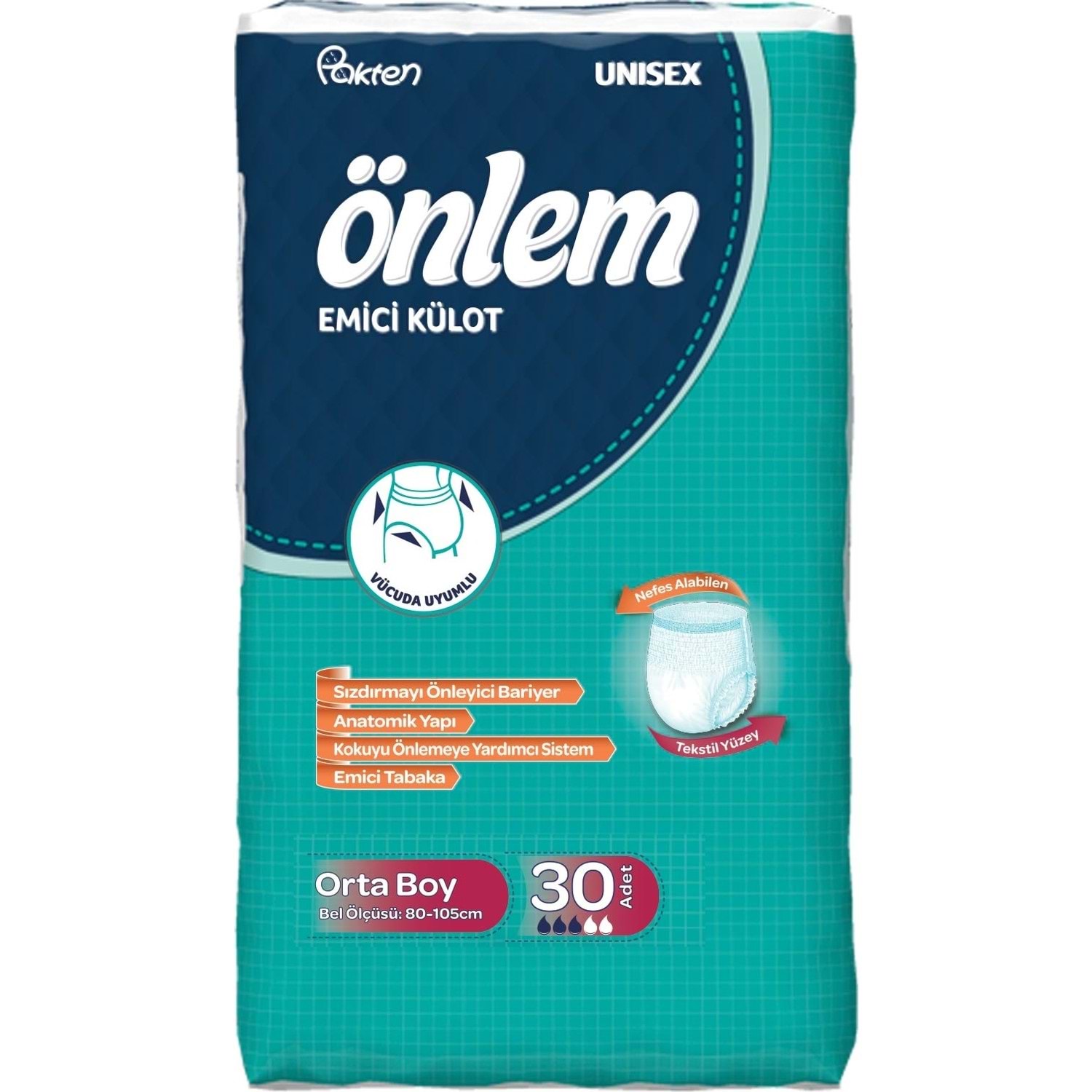 Önlem Emici Külot, idrar kaçırma sorunu yaşayanların hareketli yaşam tarzına uygun olarak tasarlanan ince yapısı ve sızdırmayı önleyici bariyerleri ile konfor ve rahatlık sağlar. -Flexi-curl teknolojisiyle bacak ve bel bölgesinde vücuda tam uyum -Anatomik Yapı -Nefes Alan Tekstil Yüzey -Kokuyu hapseden özel koku kontrol sistemi -Çift Katlı Süper Emici Tabaka -Sızdırmayı Önleyici Bariyer -Vücudu 360 derece saran elastik bel bölgesi -Kullanıldıktan sonra kolayca katlanıp çöpe atılmasını sağlayan kapama bandı