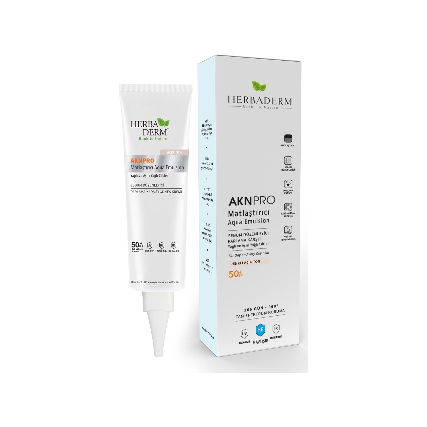 Herbaderm Aknpro Tam Spektrum Koruma Sebum Düzenleyici Yağlı Cilt Renkli Açık Ton Matlaştırıcı Aqua Emulsion 50+ SPF, Sebum Du¨zenleyici, Parlama Karşıtı, Yaglı ve Aşırı Yağlı Ciltler, “Tam Spektrum Koruma” teknolojisi sayesinde dijital cihazlardan yayılan Mavi Işık, UVA&UVB ve Infrared A ışınlarına karşı cildi korur., Nordihidroguaretik asit ve Oleanolik Asit içeren formülü ile yaglanmayı ve parlamayı azaltır, cildi matlaştırır. Antioksidan E vitamini ve Gliserin ile cildi nemlendirir. Ultra hafif dokulu, su bazlı formülü makyaj altında kullanılabilir. Günlük kullanıma uygundur. Güneş ışınlarının sadece %10’nu UV ışınlarından oluşur. Geri kalan %90’nı Mavi Işık ve Infrared ışınlarından oluşmaktadır. UV ışınlarına göre daha uzun dalga boyuna sahip Mavi Işık ve Infrared ışınları cildin derinlerine nüfuz ederek, çizgilere ve koyu lekelere neden olur, kolajen liflerini parçalar, DNA’ya hasar verir. Herbaderm AKNPRO Matlaştırıcı Aqua Emulsion Mavi Işık ve Infrared A ışınlarının neden olduğu hasarlara ve UVA&UVB ışınlarına karşı karşı cildi korur.Dermatolojik ve Oftalmolojik olarak test edilmiştir