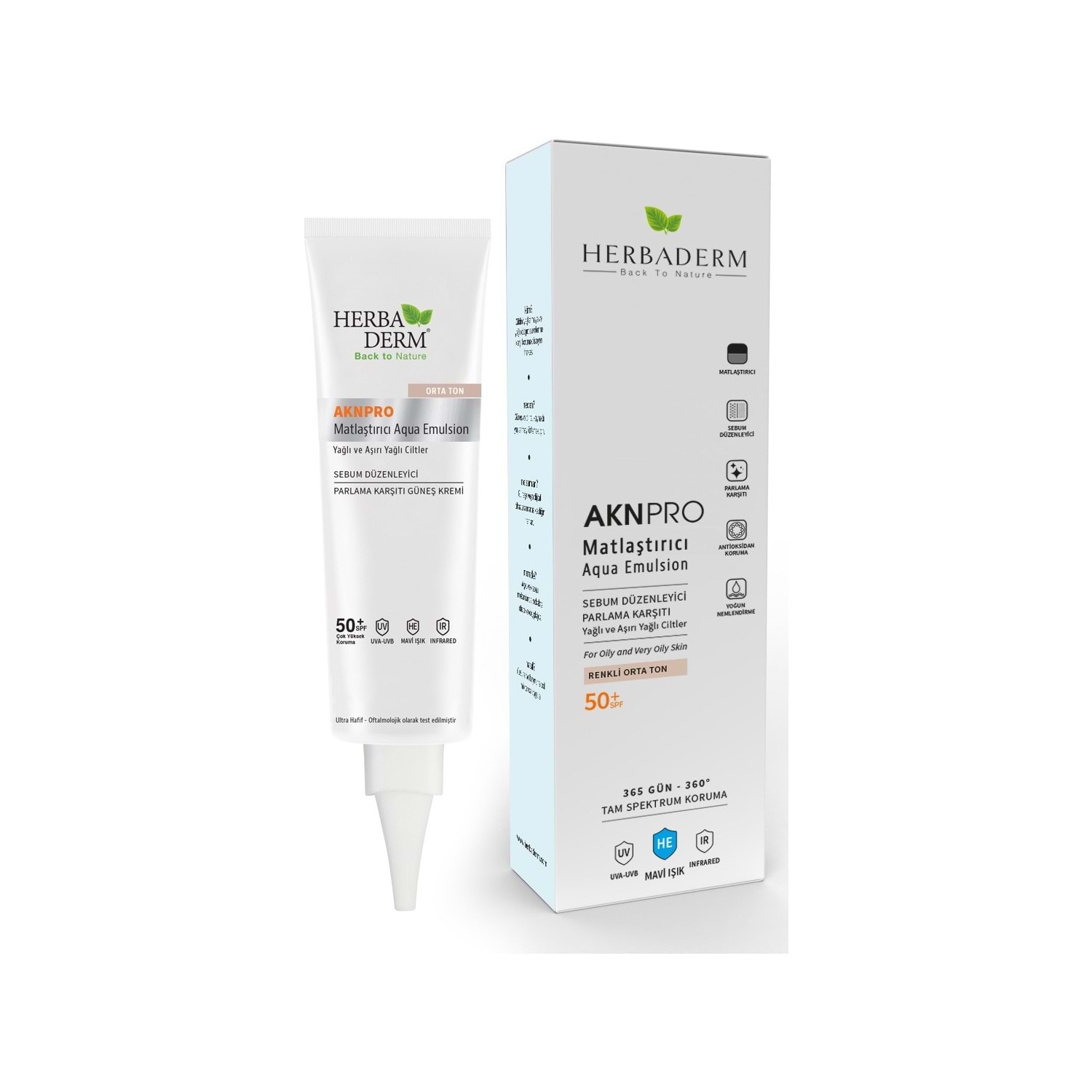 Herbaderm Aknpro Tam Spektrum Koruma Sebum Düzenleyici Yağlı Cilt Renkli Orta Ton Matlaştırıcı Aqua Emulsion 50+ SPF, Sebum Du¨zenleyici, Parlama Karşıtı, Yaglı ve Aşırı Yağlı Ciltler, “Tam Spektrum Koruma” teknolojisi sayesinde dijital cihazlardan yayılan Mavi Işık, UVA&UVB ve Infrared A ışınlarına karşı cildi korur., Nordihidroguaretik asit ve Oleanolik Asit içeren formülü ile yaglanmayı ve parlamayı azaltır, cildi matlaştırır. Antioksidan E vitamini ve Gliserin ile cildi nemlendirir. Ultra hafif dokulu, su bazlı formülü makyaj altında kullanılabilir. Günlük kullanıma uygundur. Güneş ışınlarının sadece %10’nu UV ışınlarından oluşur. Geri kalan %90’nı Mavi Işık ve Infrared ışınlarından oluşmaktadır. UV ışınlarına göre daha uzun dalga boyuna sahip Mavi Işık ve Infrared ışınları cildin derinlerine nüfuz ederek, çizgilere ve koyu lekelere neden olur, kolajen liflerini parçalar, DNA’ya hasar verir. Herbaderm AKNPRO Matlaştırıcı Aqua Emulsion Mavi Işık ve Infrared A ışınlarının neden olduğu hasarlara ve UVA&UVB ışınlarına karşı karşı cildi korur.Dermatolojik ve Oftalmolojik olarak test edilmiştir