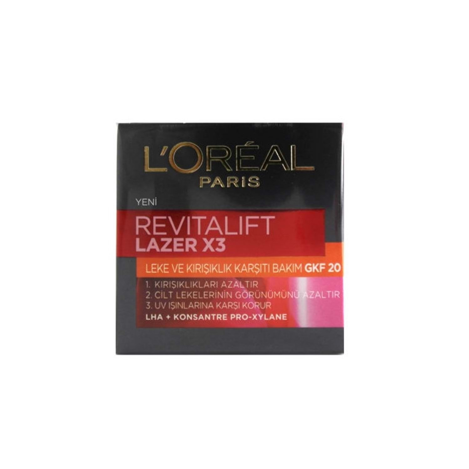 L'Oréal Paris Revitalift Lazer X3 Leke ve Kırışıklık Karşıtı Bakım GKF20 GKF20 KIRIŞIKLIKLARI AZALTIR CİLT LEKELERİNİN GÖRÜNÜMÜNÜ AZALTIR UV IŞINLARINA KARŞI KORUR 1. KIRIŞIKLIKLARI AZALTIR: 7 yıl süren araştırmalar sonucunda elde edilen ve güçlü kırışıklık karşıtı özelliklere sahip Pro-Xylane ile formüle edilmiştir.