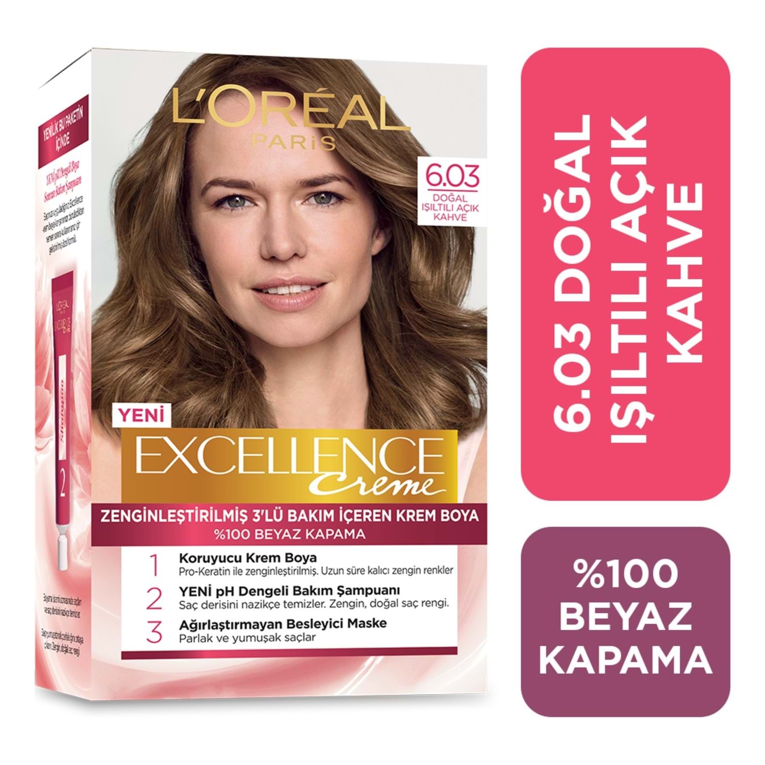 L'oréal Paris Excellence Creme Saç Boyası 6.03 Doğal Işıltılı Açık Kahve Üç aşamalı komple bakım.Pro-keratin + Seramid + Ionene G ile güçlendirir, korur, yeniler.100% beyaz kapama.Zengin, parlak, uzun süre kalıcı saç rengi.Boya Öncesi Koruyucu Serum'u saçlarınızın heryerine uygulayın. Krem Saç Boyasını Oksidan Krem şişesinin içine dökün ve kapağı kapadıktan sonra iyice çalkalayın. Saçınıza uygulayın. 30 dakika bekleyin ve saçlarınızı su ile duruladıktan sonra Boya Sonrası Koruyu Bakım Kremini uygulayın.TÜM CİLT/SAÇ TİPLERİHer yaşa uygun