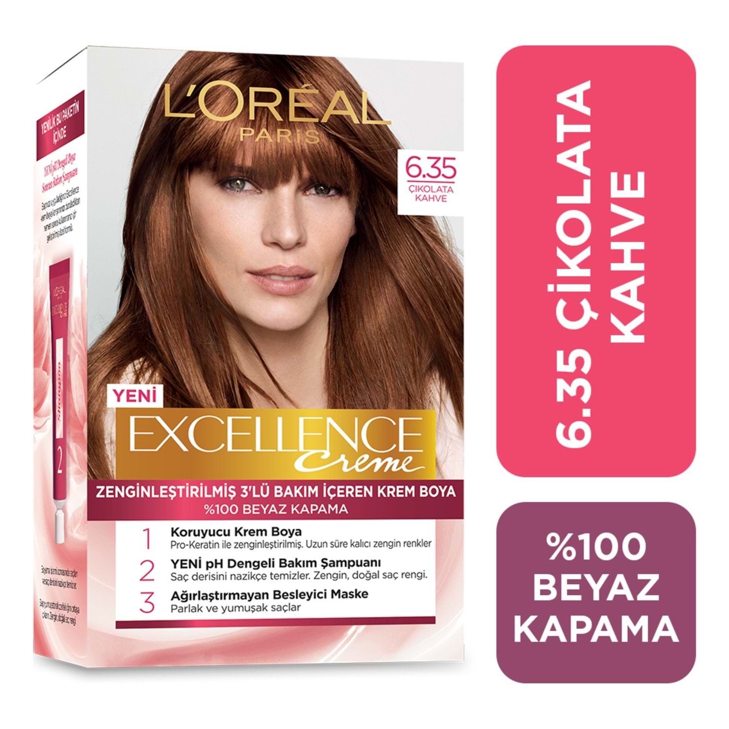 L'Oréal Paris Excellence Creme Saç Boyası 6.35 Çikolata Kahve Üç aşamalı komple bakım.Pro-keratin + Seramid + Ionene G ile güçlendirir, korur, yeniler.100% beyaz kapama.Zengin, parlak, uzun süre kalıcı saç rengi.Boya Öncesi Koruyucu Serum'u saçlarınızın heryerine uygulayın. Krem Saç Boyasını Oksidan Krem şişesinin içine dökün ve kapağı kapadıktan sonra iyice çalkalayın. Saçınıza uygulayın. 30 dakika bekleyin ve saçlarınızı su ile duruladıktan sonra Boya Sonrası Koruyu Bakım Kremini uygulayın.TÜM CİLT/SAÇ TİPLERİHer yaşa uygun
